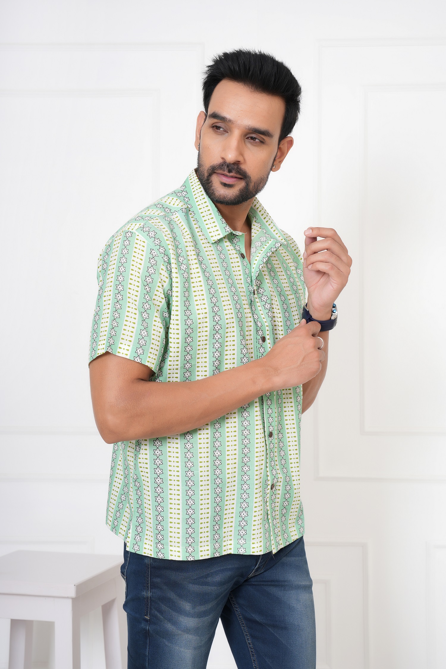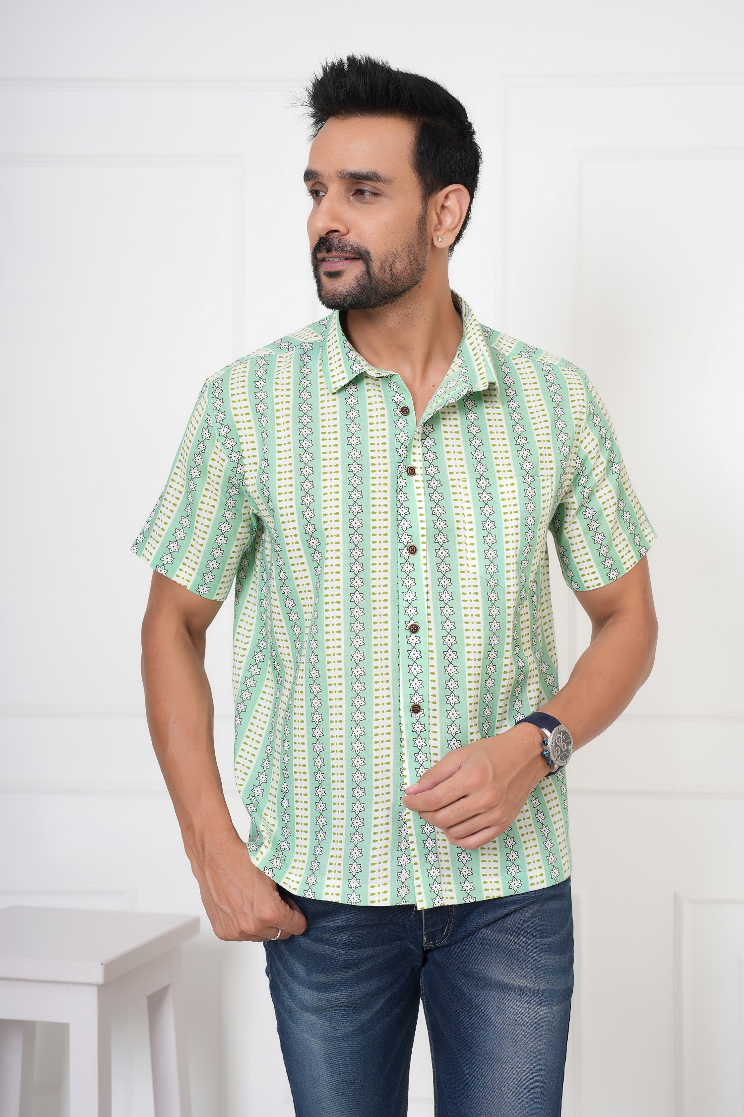 Bold. Minimal. Timeless. Beautiful stars on light green shirt by Avigyah features striking white handblock prints on a deep Light green base, exuding sharp ethnic elegance. Perfect for evening get-togethers, casual Fridays, or cultural nights, this shirt is handcrafted from 100% Sanganeri cotton for unbeatable breathability and comfort.