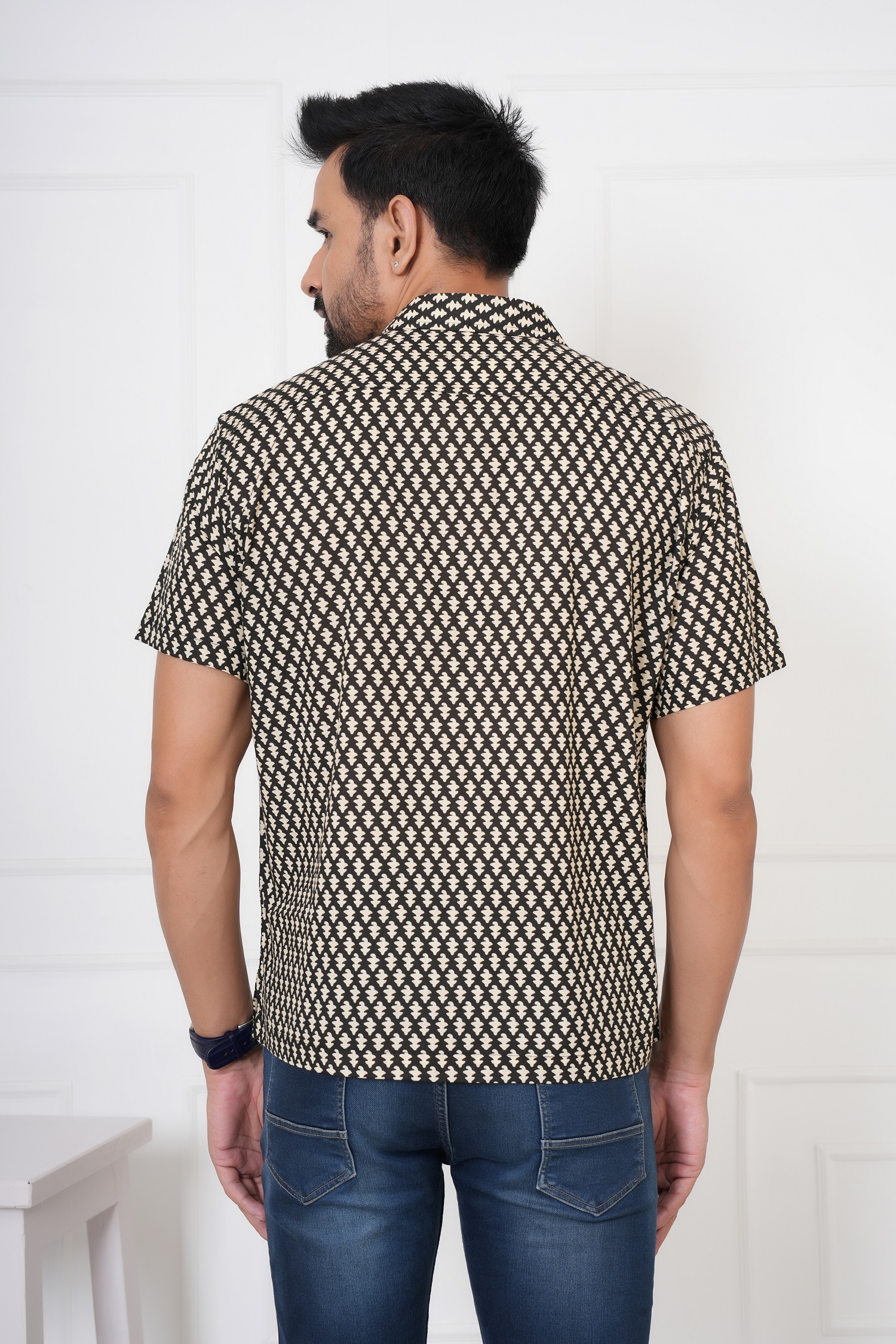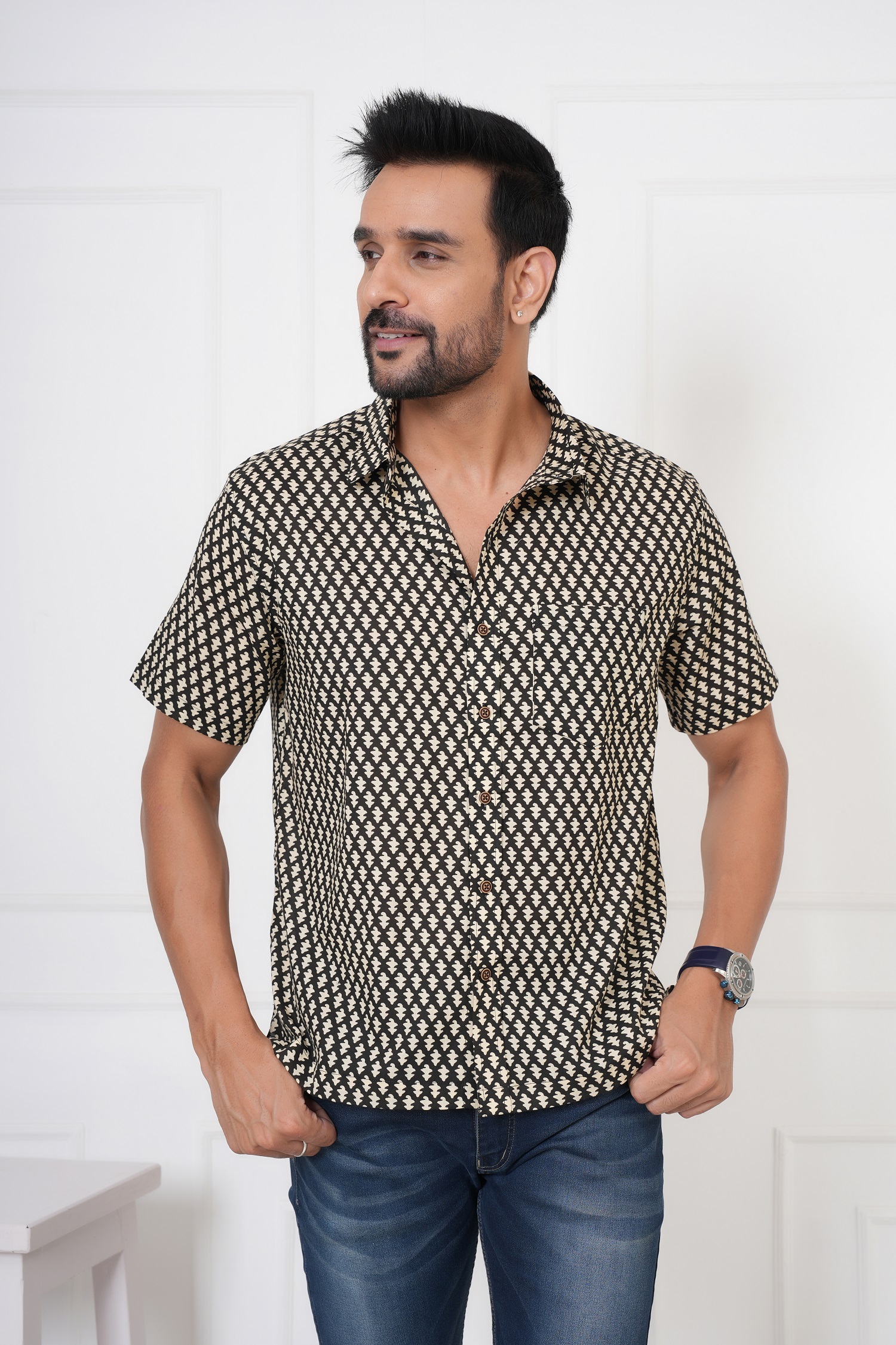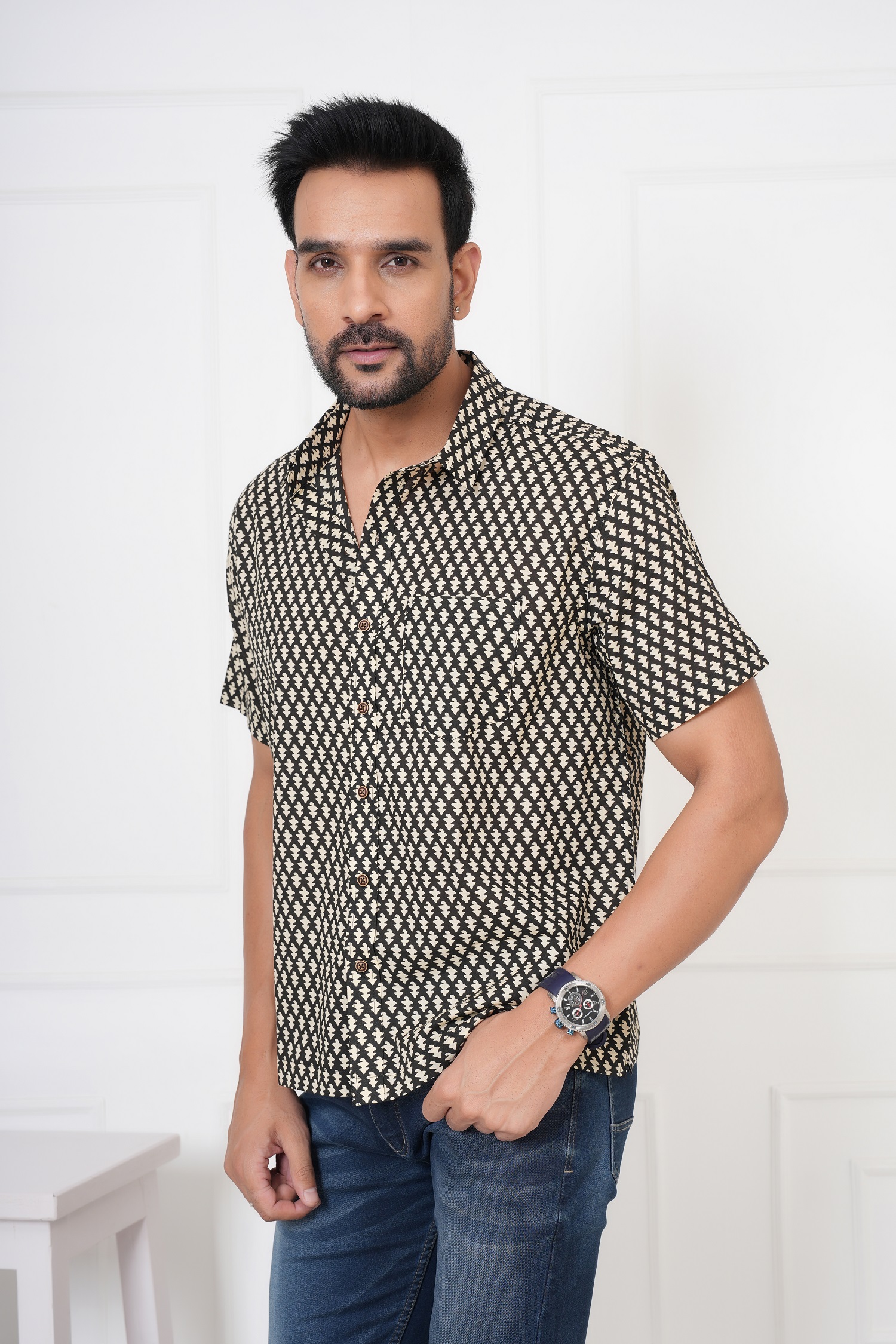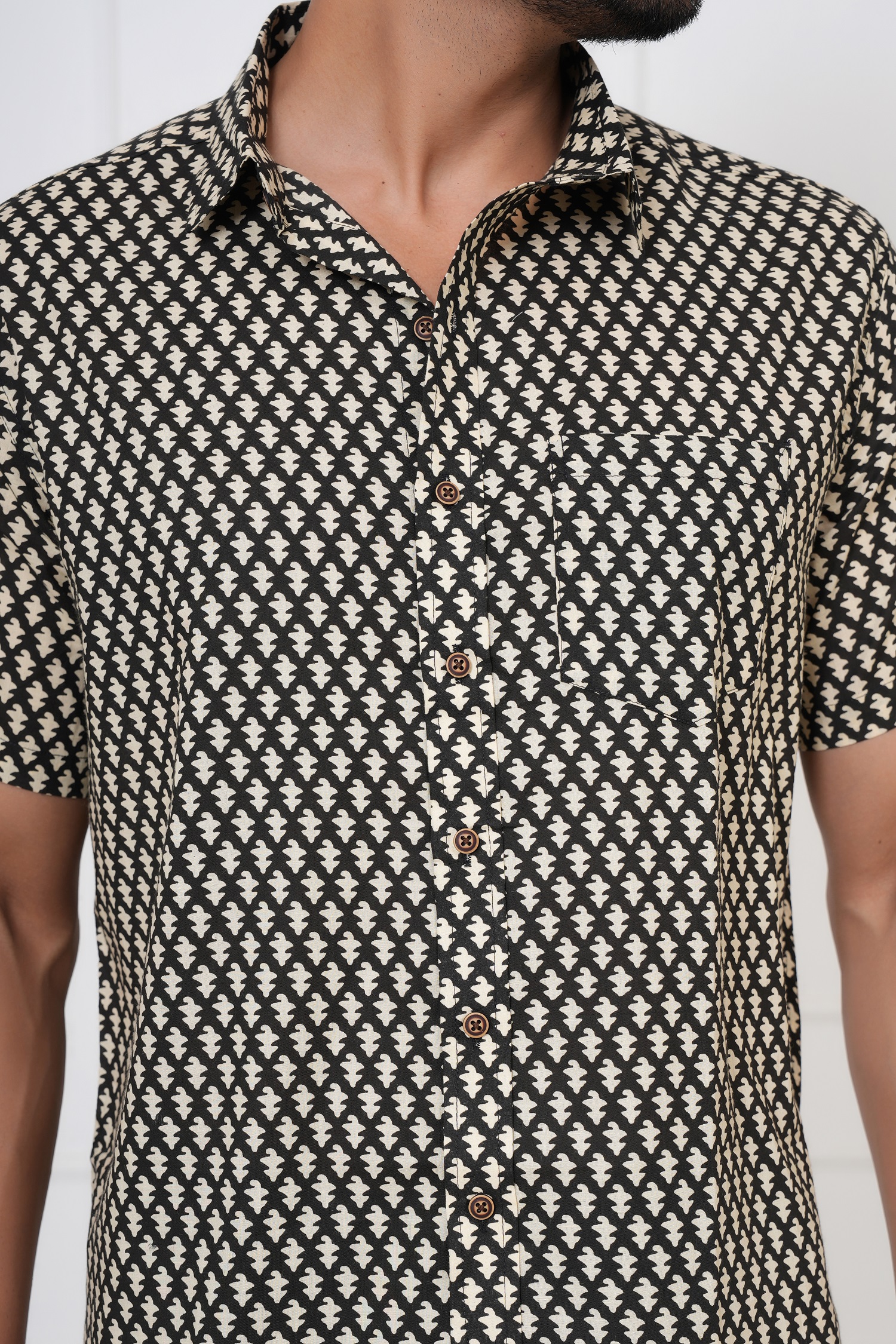 Bold. Minimal. Timeless. The Beautiful white flower booty on Black Cotton Shirt by Avigyah features striking white handblock prints on a deep black base, exuding sharp ethnic elegance. Perfect for evening get-togethers, casual Fridays, or cultural nights, this shirt is handcrafted from 100% Sanganeri cotton for unbeatable breathability and comfort.