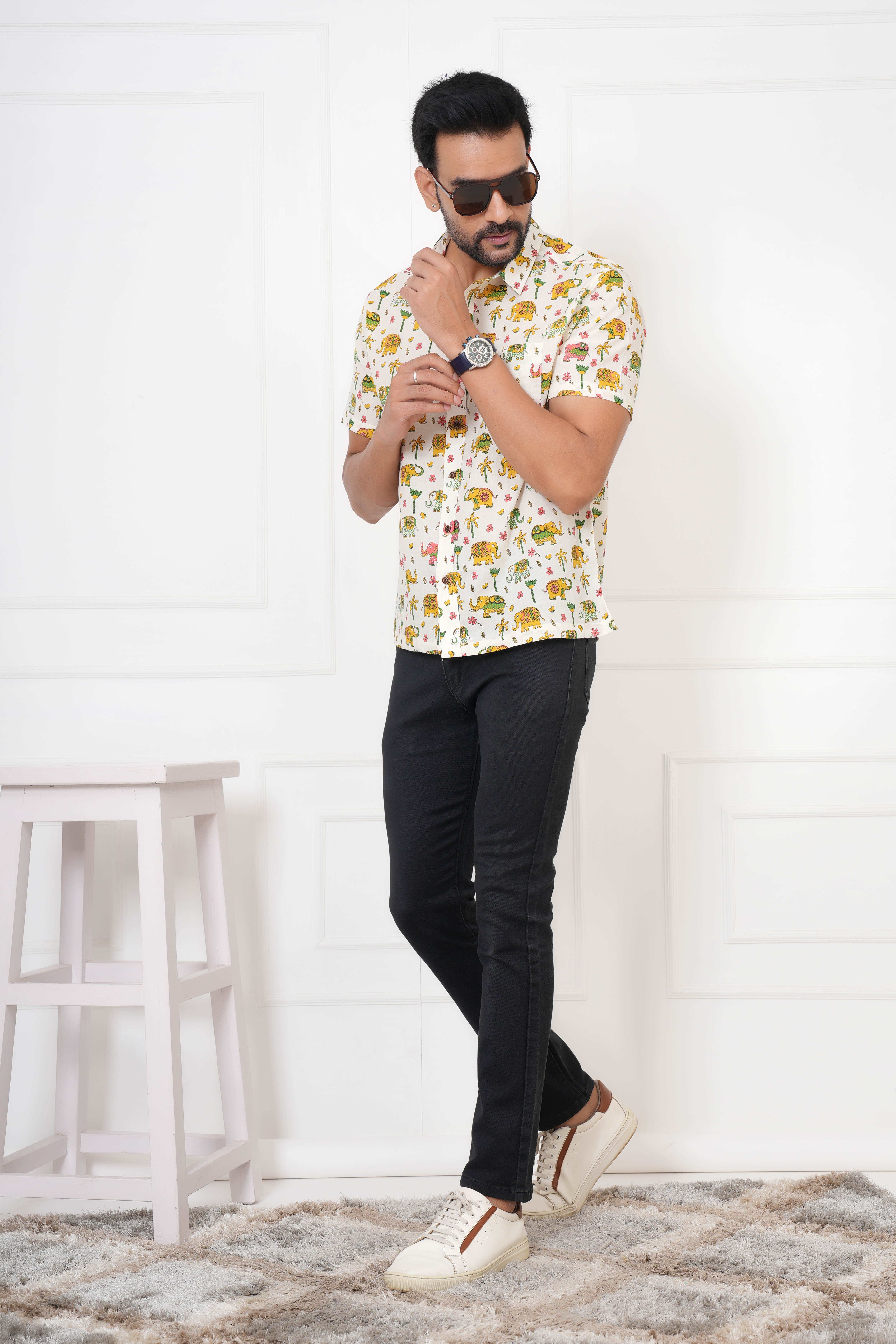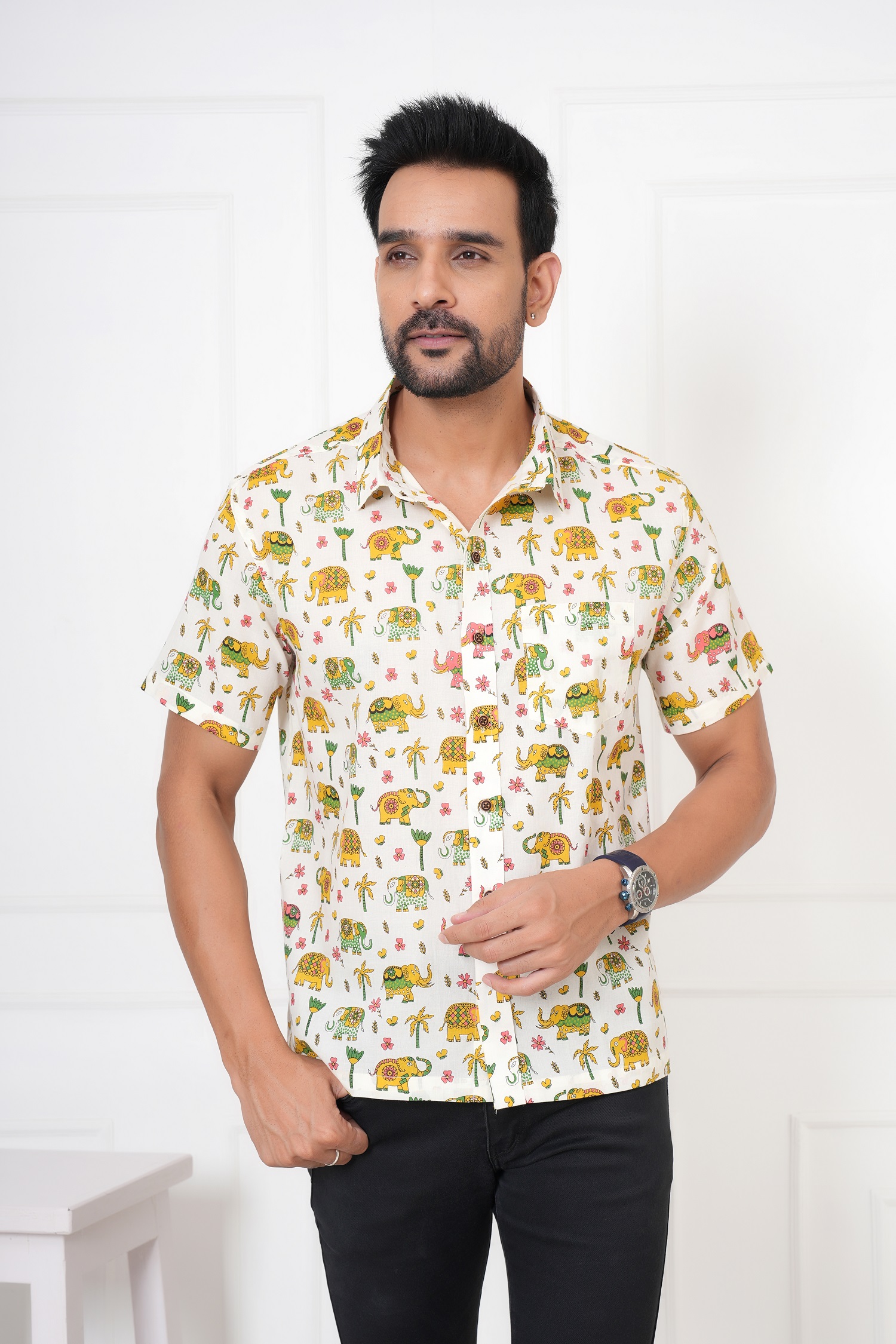 Bold. Minimal. Timeless. Vibrant multi colour elephant printed cotton shirt by Avigyah features striking white handblock prints on a deep cream base, exuding sharp ethnic elegance. Perfect for evening get-togethers, casual Fridays, or cultural nights, this shirt is handcrafted from 100% Sanganeri cotton for unbeatable breathability and comfort.