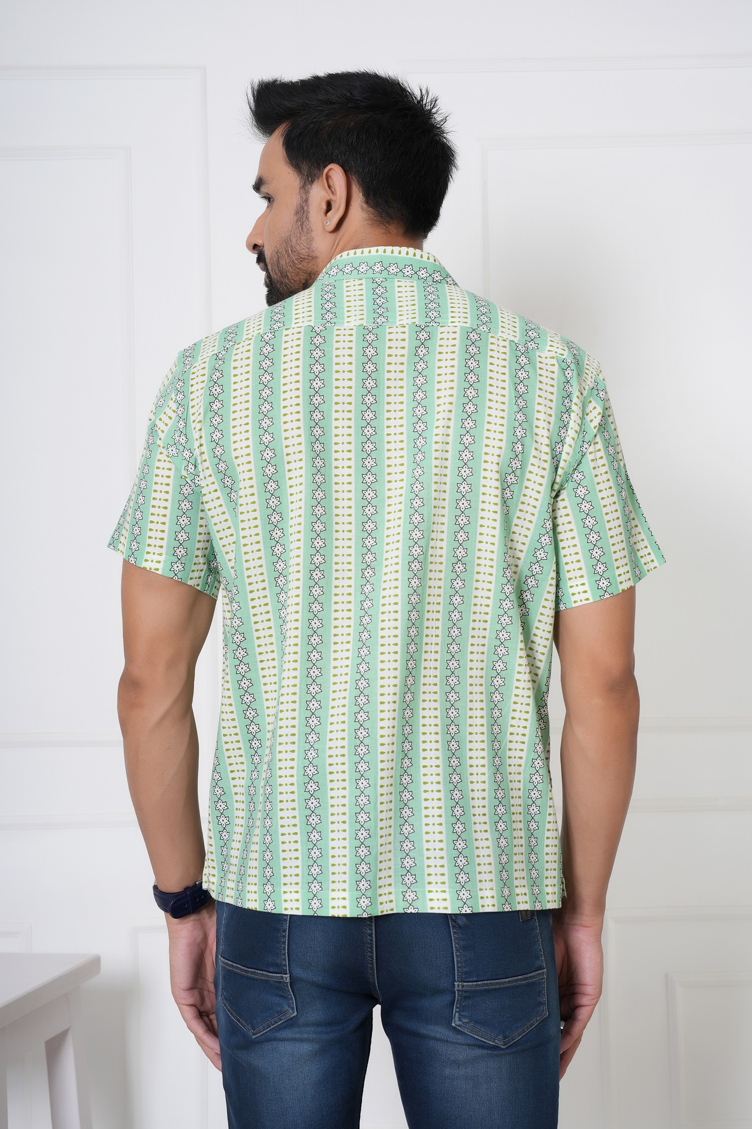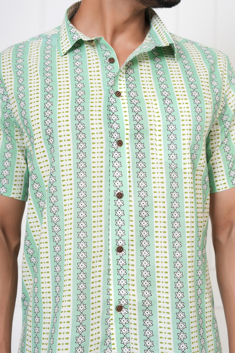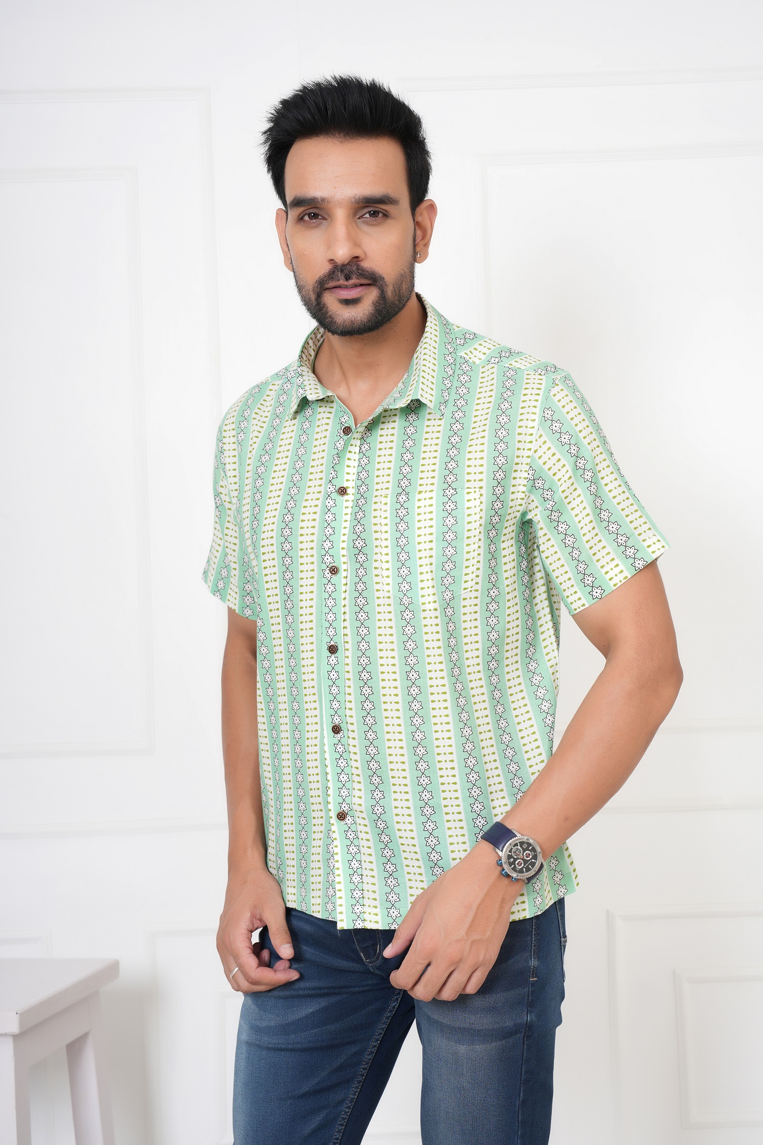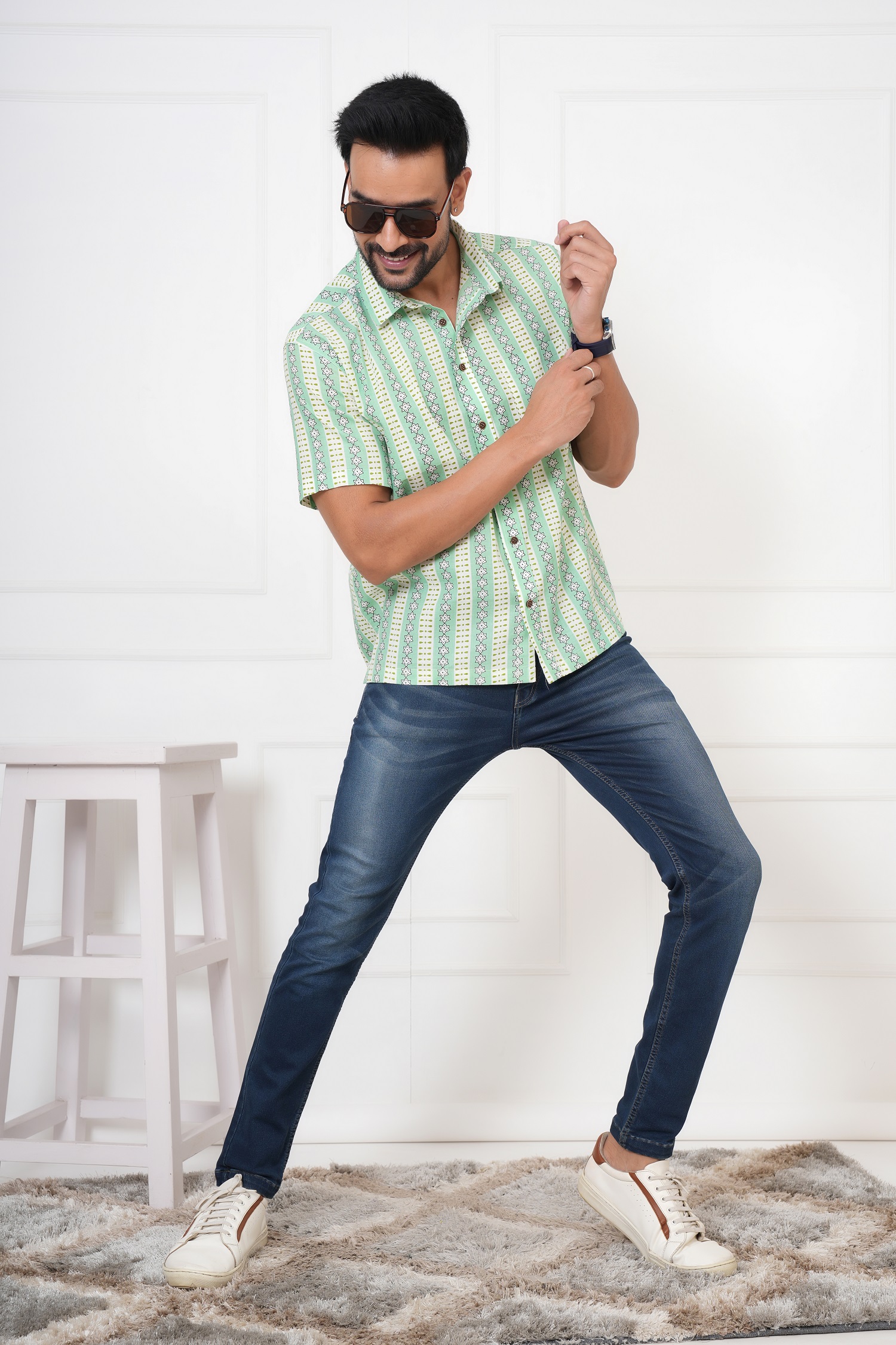 Bold. Minimal. Timeless. Beautiful stars on light green shirt by Avigyah features striking white handblock prints on a deep Light green base, exuding sharp ethnic elegance. Perfect for evening get-togethers, casual Fridays, or cultural nights, this shirt is handcrafted from 100% Sanganeri cotton for unbeatable breathability and comfort.