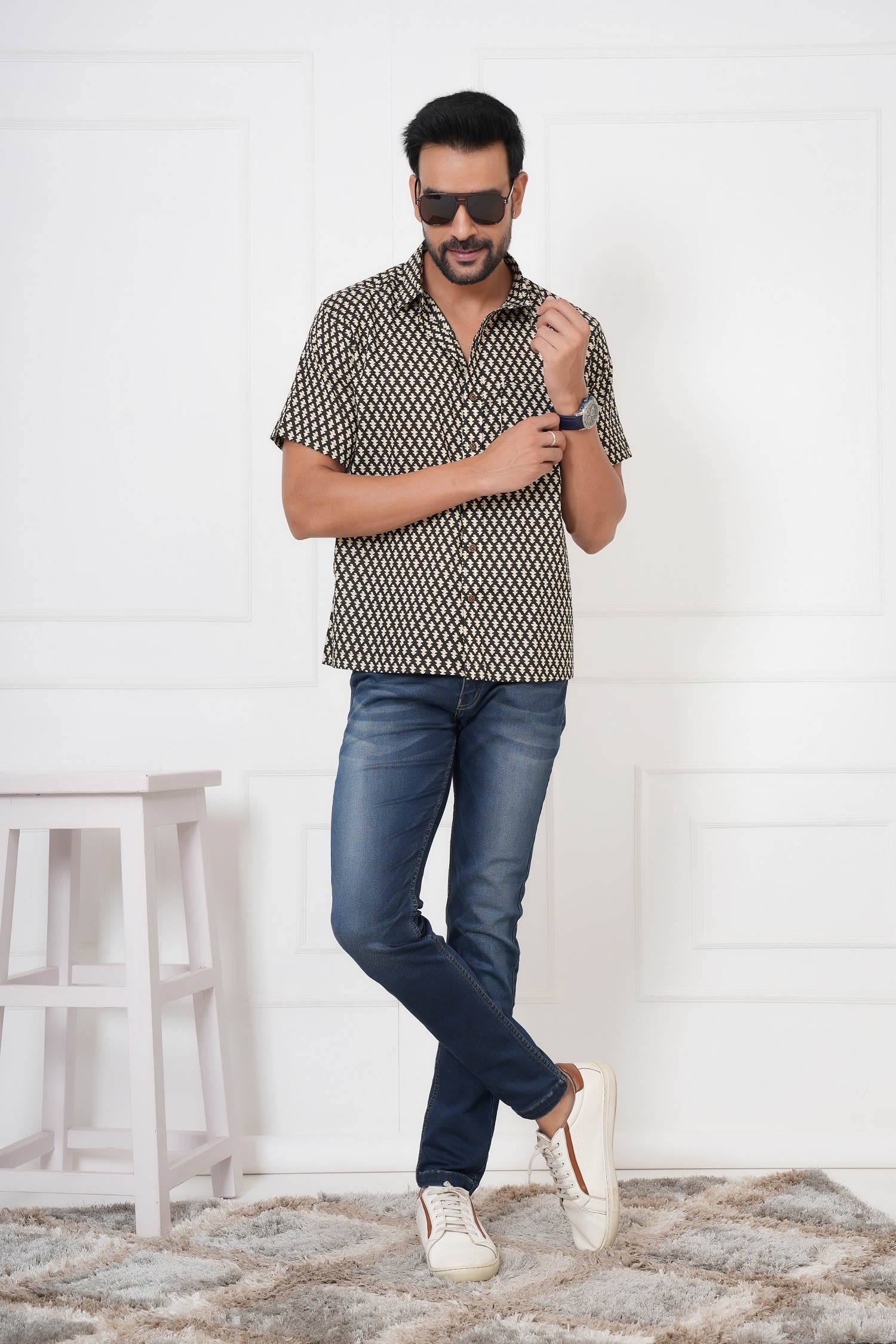 Bold. Minimal. Timeless. The Beautiful white flower booty on Black Cotton Shirt by Avigyah features striking white handblock prints on a deep black base, exuding sharp ethnic elegance. Perfect for evening get-togethers, casual Fridays, or cultural nights, this shirt is handcrafted from 100% Sanganeri cotton for unbeatable breathability and comfort.
