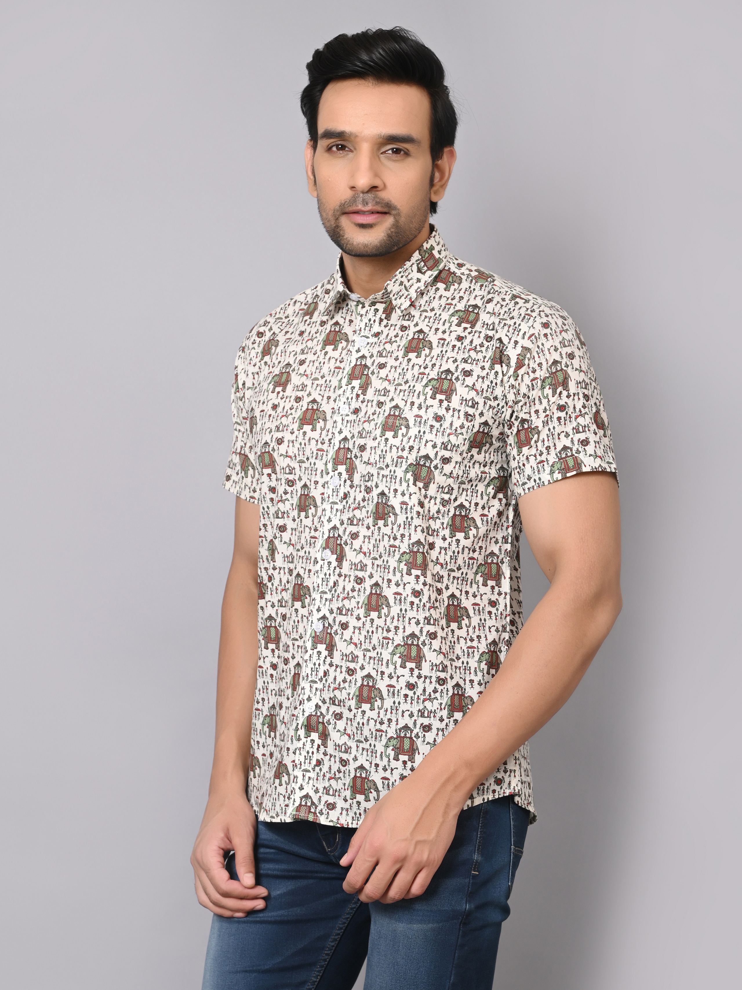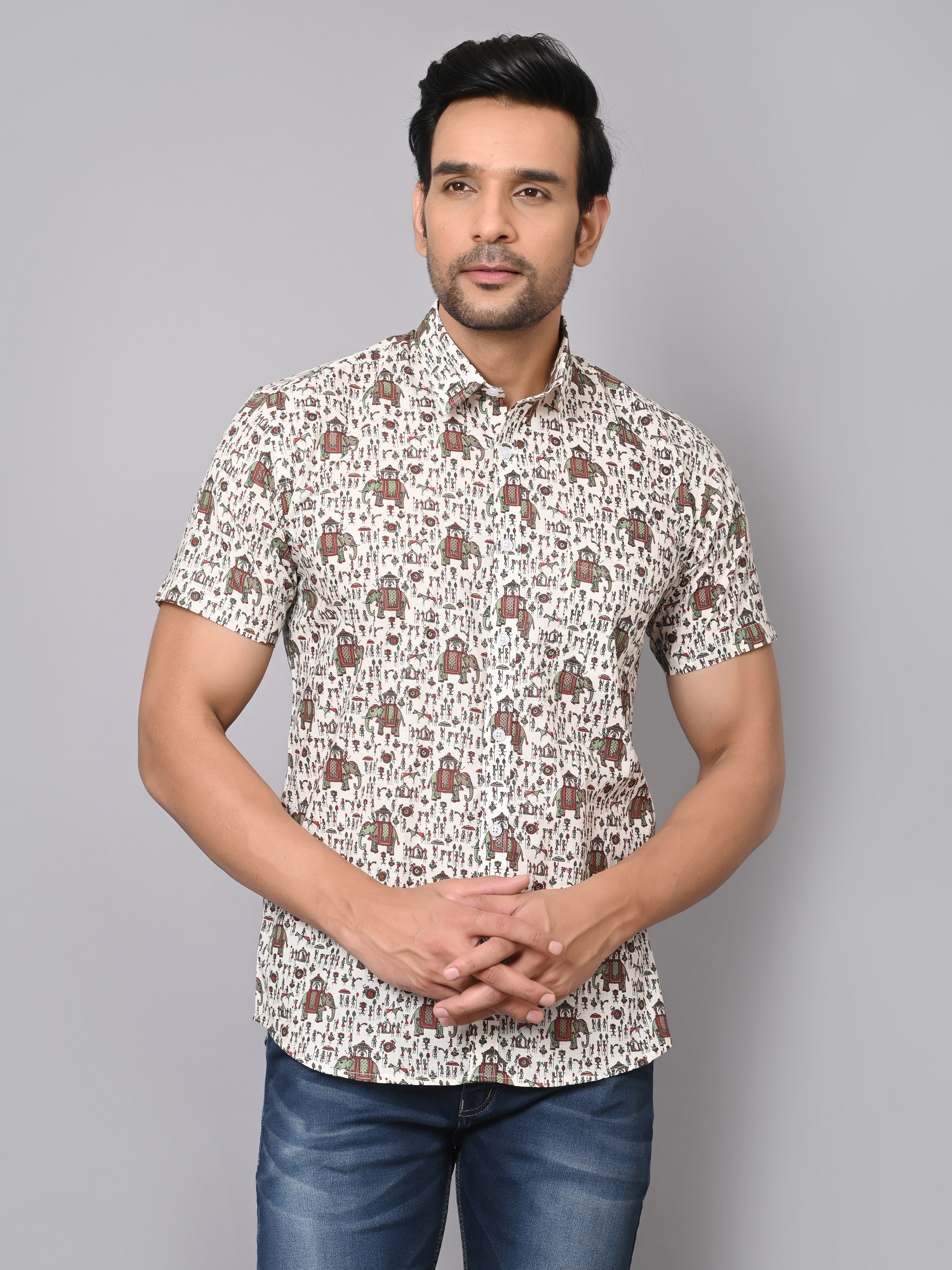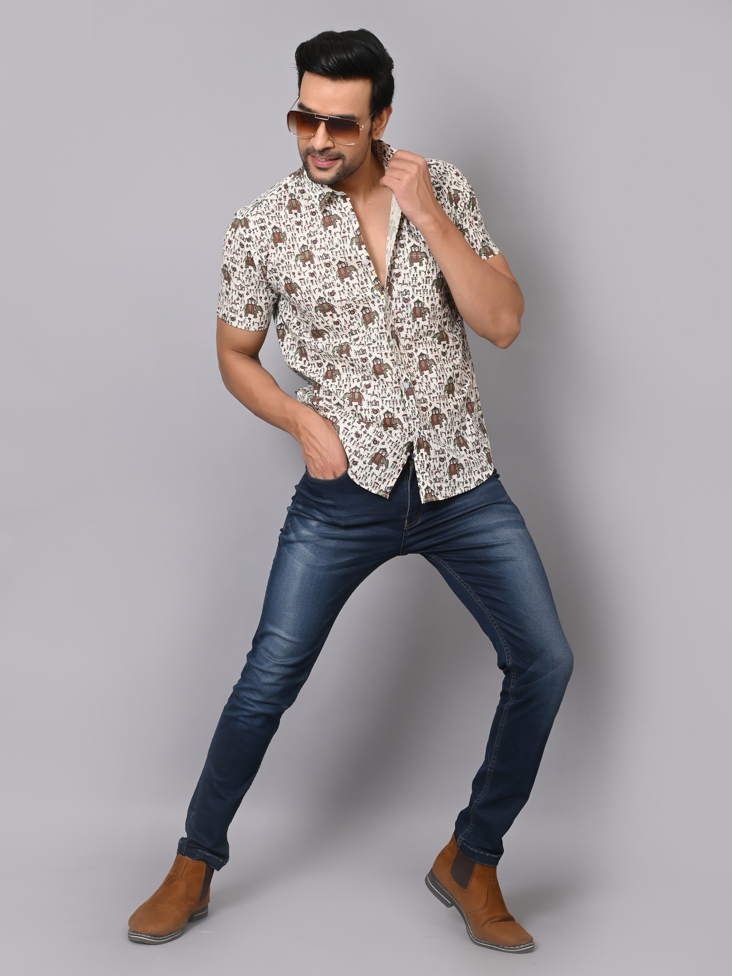 Unleash your wild side with Elephant Print — a bold twist on Rajasthani block printing. This shirt fuses tribal energy with urban edge. Crafted in breathable Sanganeri cotton, it's your go-to for statement looks, music nights, or weekend escapes.