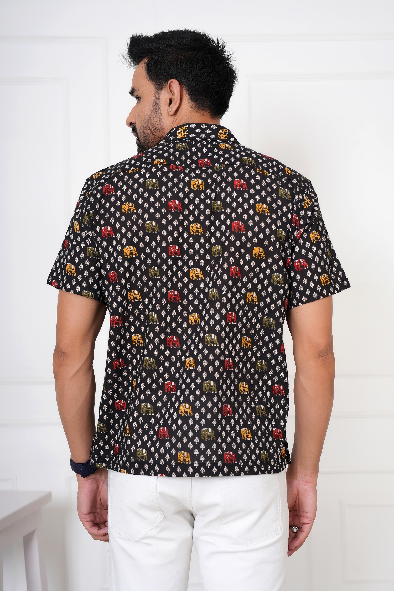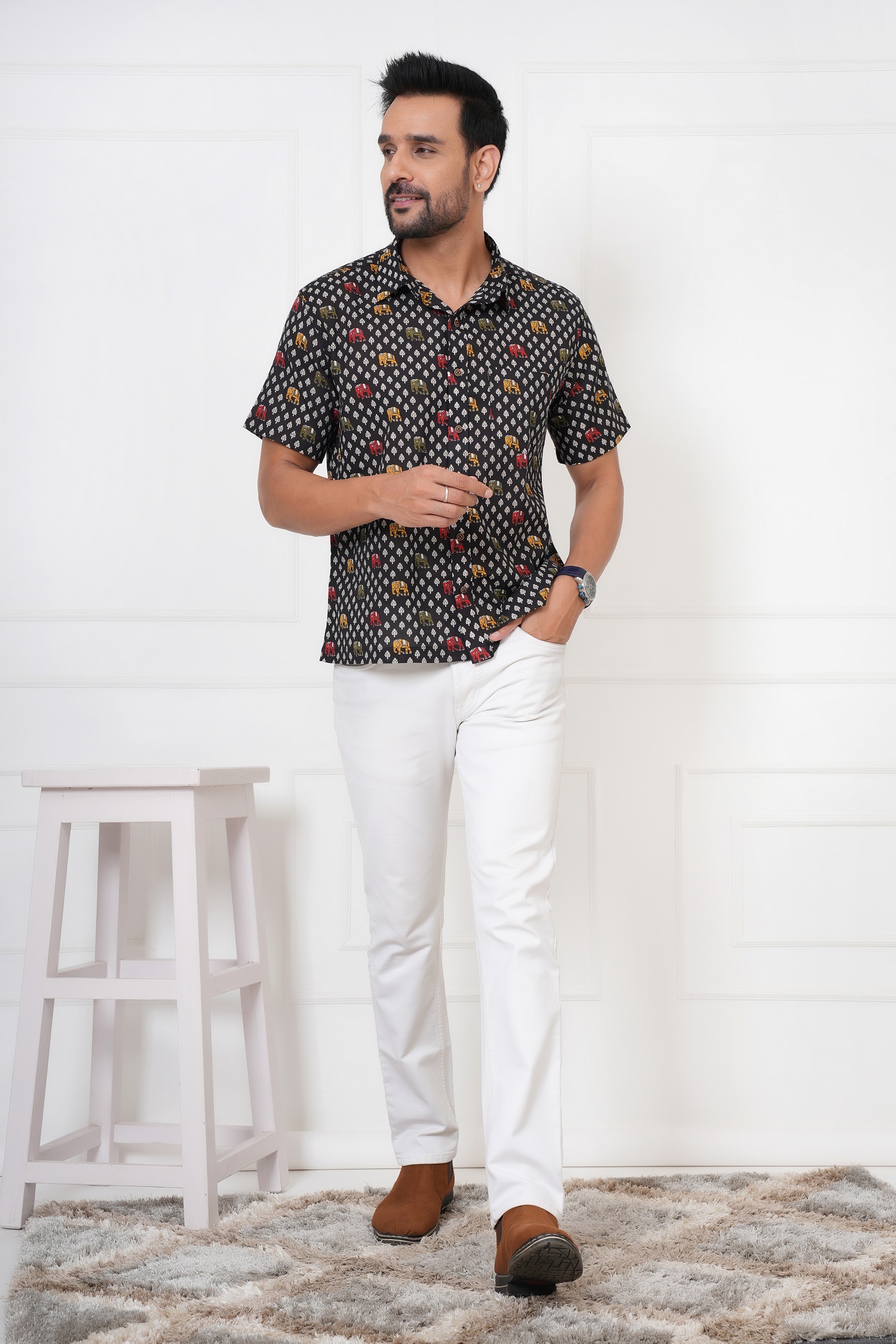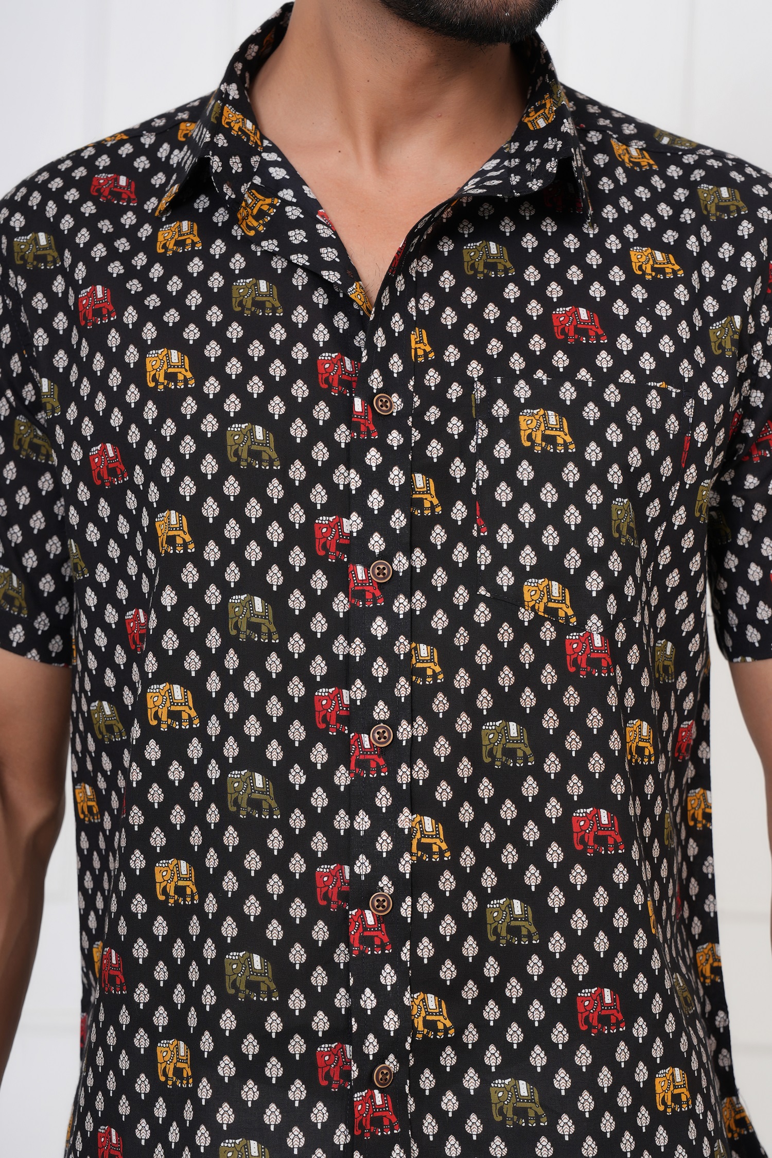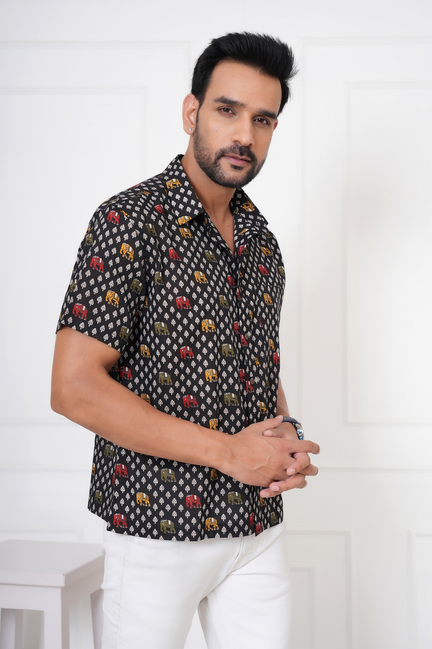 Bold. Minimal. Timeless. The Multi Colour Elephant shirt by Avigyah features striking white handblock prints on a deep black base, exuding sharp ethnic elegance. Perfect for evening get-togethers, casual Fridays, or cultural nights, this shirt is handcrafted from 100% Sanganeri cotton for unbeatable breathability and comfort.