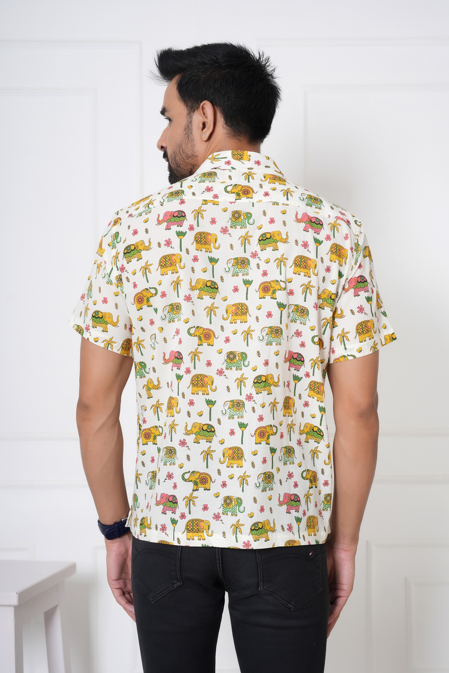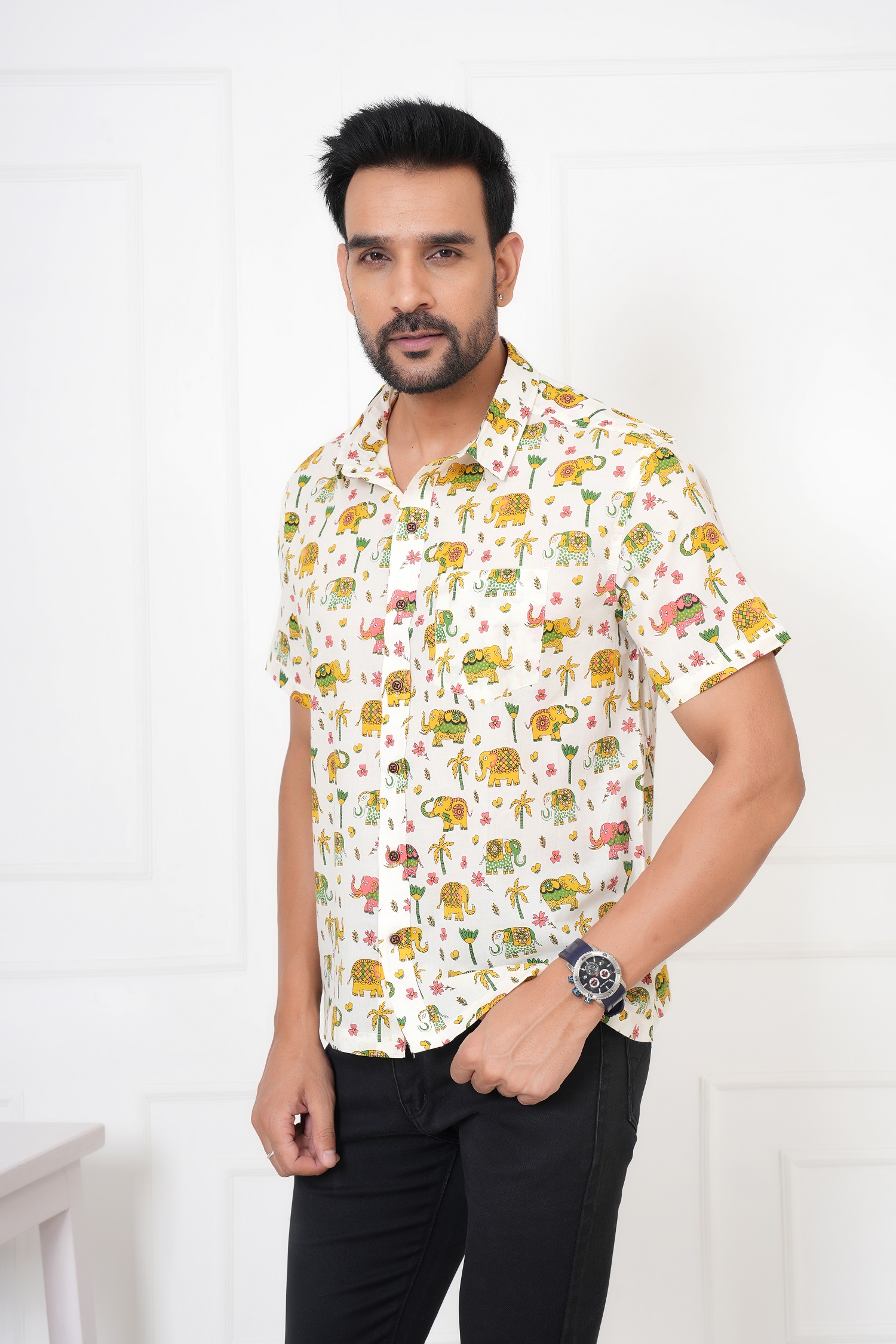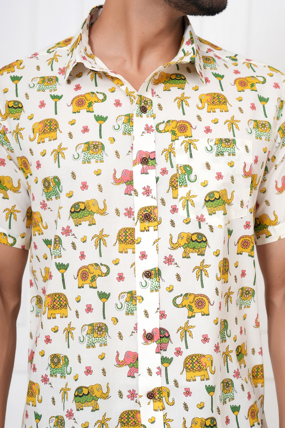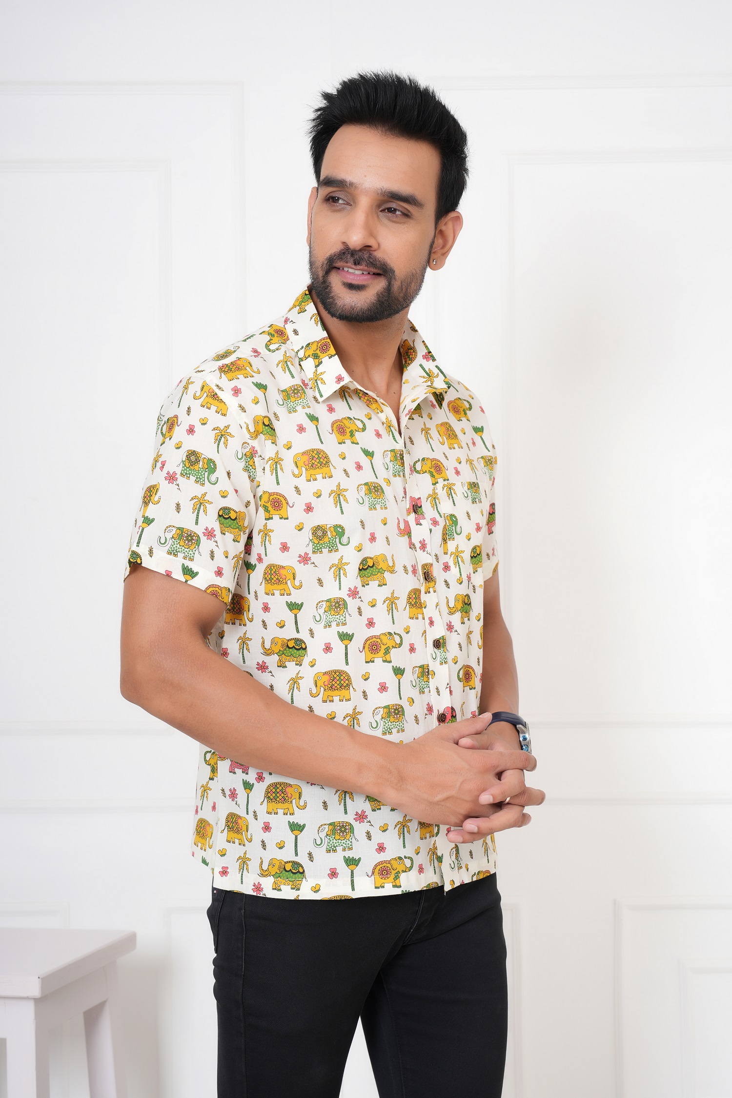 Bold. Minimal. Timeless. Vibrant multi colour elephant printed cotton shirt by Avigyah features striking white handblock prints on a deep cream base, exuding sharp ethnic elegance. Perfect for evening get-togethers, casual Fridays, or cultural nights, this shirt is handcrafted from 100% Sanganeri cotton for unbeatable breathability and comfort.